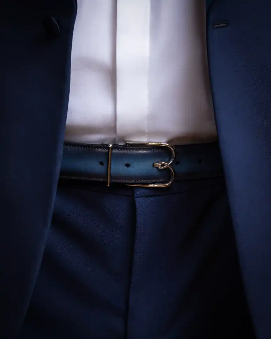 That journey began back in 1895, when a young Alessandro Berluti moved from his native Italy to Paris to practise his trade as a shoemaker, starting with lace-up court shoes. His clients included Jean Cocteau, Marcello Mastroianni and Andy Warhol. In the past 15 years, under the leadership of Antoine Arnault (who now serves as chairman of Berluti while also performing a wider role within the LVMH group, with Jean-Marc Mansvelt taking over as ceo), the house began to offer a full look, including leather goods and ready-to-wear. Aside from the technical knowledge that went into constructing the garments, Le Goff also sought to ensure that the designs channelled the sense of elegance synonymous with French and, in particular, Parisian fashion – hence the focus on the deep Tricolore blue, tuxedo dressing and slim silhouettes typical of French-style suiting.