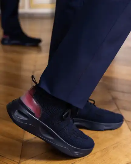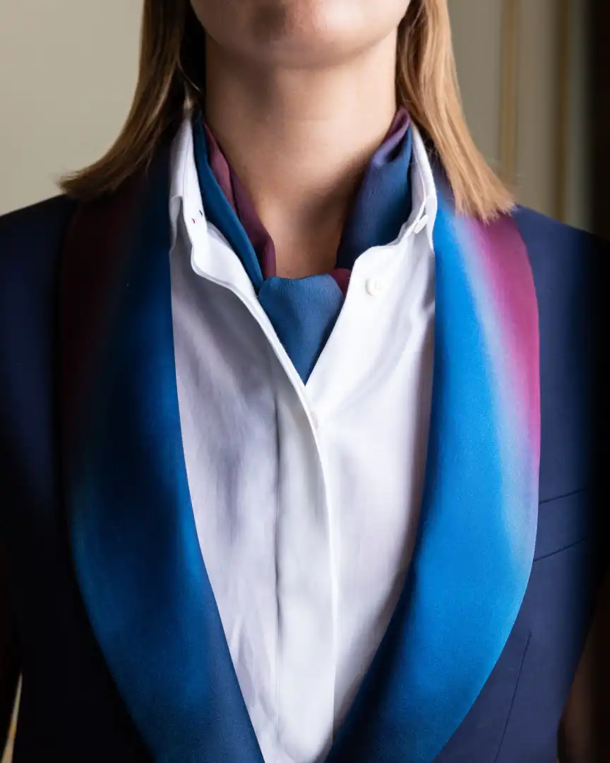 Many of these conversations would go on to inform the final design of the opening ceremony’s uniforms: elegant midnight-blue suits with collars featuring the colours of the French flag, remixed in the house’s trademark patina. Female athletes will wear a sleeveless version of the tuxedo jacket and choose between trousers or a silk wraparound skirt. The looks are finished with Berluti’s signature woven Shadow sneakers in a similar navy hue, or the flexible Lorenzo leather loafers. “From the very beginning of the process, we considered every detail – for instance, we chose a wrap skirt so that it can be altered easily and didn’t use any pleating because it’s uncomfortable for athletes in wheelchairs,” says Le Goff. “And the sleeve length is adjustable to make it easier for athletes. We’re experts in this field and can adjust quickly.”